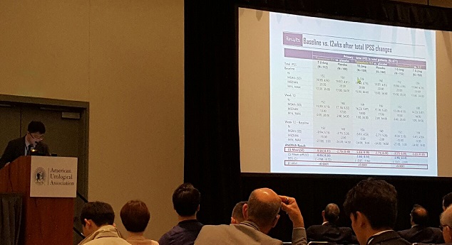 ▲ 한양의대 이승욱 교수가 미국비뇨기과학회에서 ‘한미탐스 0.4mg’의 임상결과를 발표하고 있다.