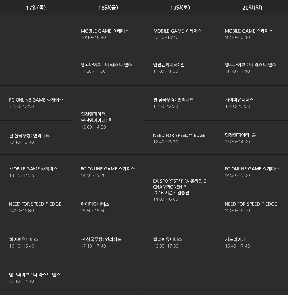 이 중 온라인 게임 시연작은 ▲횡스크롤 AOS '하이퍼유니버스' ▲레이싱 게임 '니드포스피드엣지' ▲다중접속역할수행게임(MMORPG) '페리아 연대기', '천애명월도' ▲일인칭슈팅(FPS) 게임 '로브레이커즈' ▲TCG와 MMORPG를 결합한 '아스텔리아' 등이 있다.