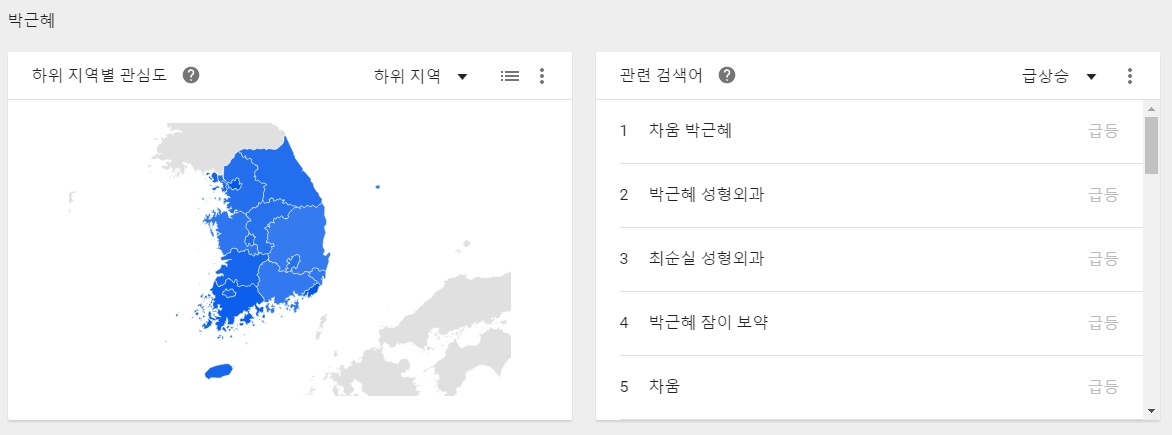 15일부터 지난 1주일간의 데이터에 따르면 우선 박 대통령과 관련된 급상승 검색어는 ▲차움 박근혜, ▲박근혜 성형외과, ▲최순실 성형외과, ▲박근혜 잠이 보약, ▲차움 등이며, 인기순 검색어는 ▲박근혜, ▲박근혜 사생아, ▲최태민 박근혜 사생아, ▲최순실, ▲박근혜 하야 등이다.