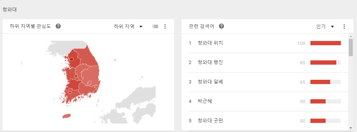 이어 청와대와 관련된 급상승 검색어엔 ▲최순실 성형외과, ▲청와대 성형외과, ▲청와대 화장품, ▲존제이콥스, ▲김영재 성형외과 등이 있으며, 인기순 검색어는 ▲청와대 위치, ▲청와대 행진, ▲청와대 일베, ▲박근혜, ▲청와대 굿판 등이 있다.