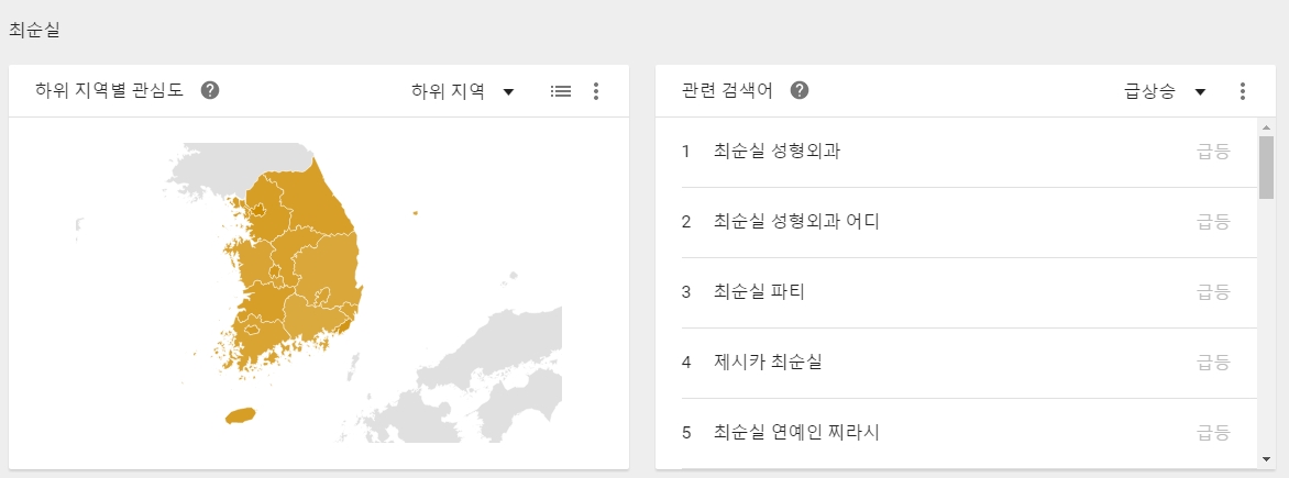 또, 최순실씨와 관련한 검색어는 급상승 검색어에 ▲최순실 성형외과, ▲최순실 성형외과 어디, ▲최순실 파티, ▲제시카 최순실, ▲최순실 연예인 찌라시 등이, 인기순 검색어에는 ▲최순실 연예인, ▲최순실 성형외과, ▲최순실 가수, ▲박근혜, ▲정유라 등이 있다.