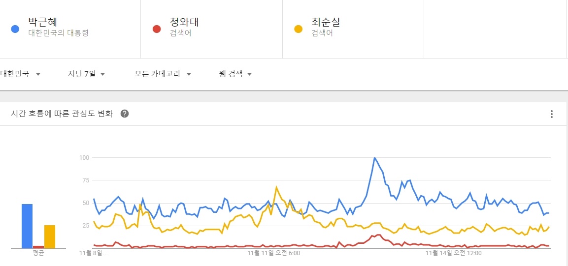 키워드의 검색 빈도 변화(급상승)와 누적된 검색 빈도(인기순)를 그래프로 보여주는 구글 트렌드를 이용해 애플경제는 국정농단의 핵심에 있는 최순실씨와 박근혜 대통령, 그리고 청와대와 관련된 키워드를 살펴봤다.