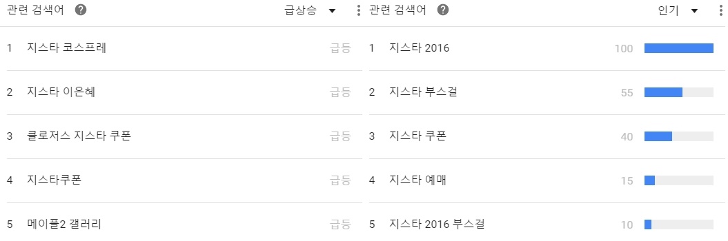 그렇다면 지스타가 개최된 동안 관객들이 가장 관심을 가졌던 키워드는 뭘까. 애플경제가 구글 트렌드를 통해 지난 1주 동안의 검색어를 살펴본 결과, 급상승한 검색어는 ‘지스타 코스프레’, ‘지스타 이은혜’가, 인기 검색어는 ‘지스타 2016’, ‘지스타 부스걸’ 등이 상위권을 차지했다.