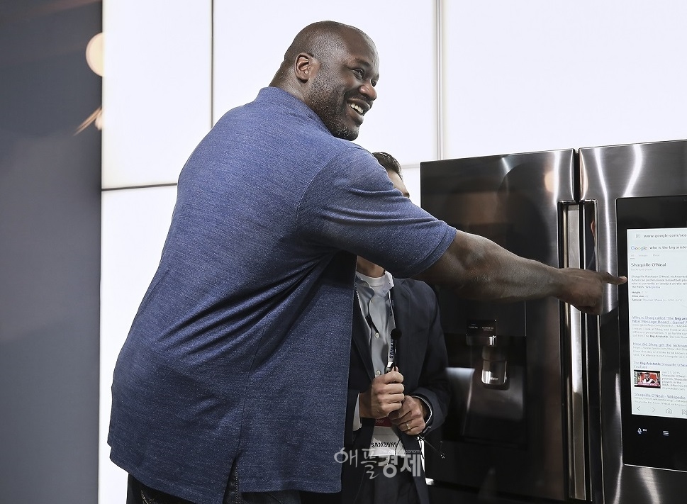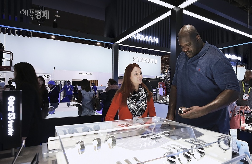 [애플경제] 미국 NBA의 전설적인 농구선수 샤킬 오닐이 5일(현지시간) 라스베이거스에서 열린 ‘CES 2017’에 참가한 삼성전자 전시관을 방문했다.
