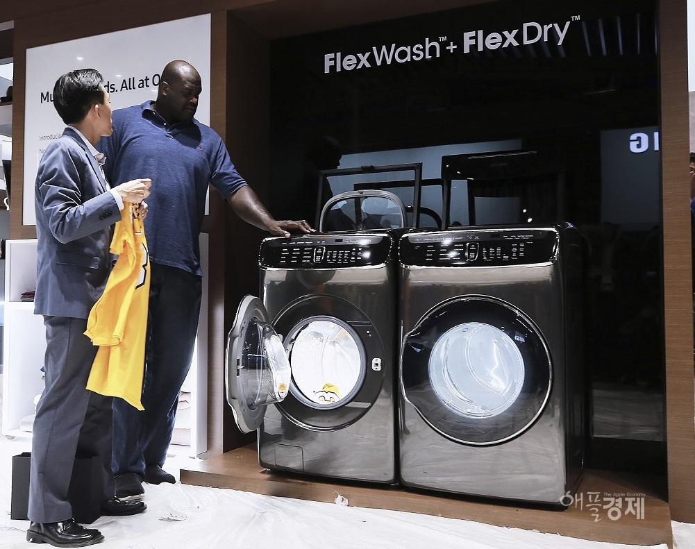 이날 샤킬 오닐은 삼성전자 전시관에서 ‘플렉스워시’, ‘플렉스드라이’, ‘패밀리허브 2.0’, ‘기어S3’ 등 다양한 제품들을 살펴봤다.
