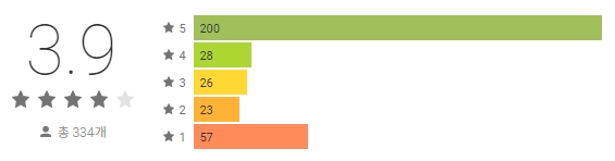 별점 리뷰 또한 저조하다. 구글 앱스토어 기준으로 평가한 유저는 334명에 불과하지만 총점 3.9점이란 점수는 ‘호평을 받았다’고 말할 수 없는 수준이다.
