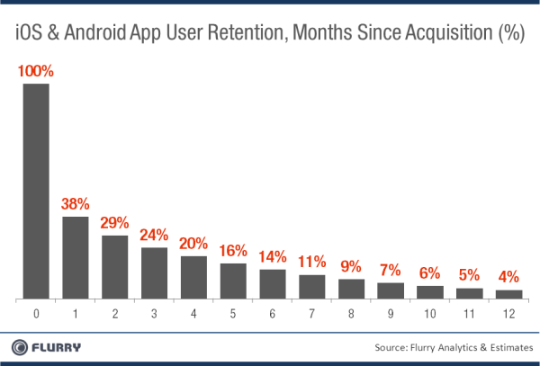 물론 출시 직후이기에 점차 성장할 것이라는 낙관적인 전망이나 변명도 가능하다. 하지만 모바일 앱의 흥행은 게임과 기능성 앱 모두 보통 출시 초기에 명암이 갈린다는 사실 또한 무시할 수는 없다. 전 세계 25만개 이상의 개발사에서 사용하고 있는 플러리(Flurry)의 자료에 따르면 출시된 앱들의 활동성은 설치 이후 1개월 안에 62%나 감소한다.