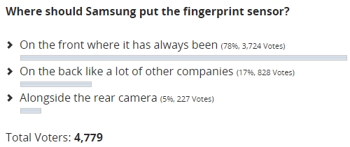 실제로 삼성전자 전문 IT 매체 샘모바일이 '삼성은 갤럭시S8 지문인식 센서를 어디에 뒀어야 할까?(Where should Samsung put the fingerprint sensor?)'는 이름으로 4779명의 소비자를 대상으로 한 설문에 따르면 3723명(78%)은 ‘늘 그랬듯 전면에(On the front where it has always been)’, 828명(17%)은 ‘다른 회사들처럼 후면에(On the back like a lot of other companies)’라고 대답했으며, 삼성이 선택한 위치는 단 5%에 불과한 227명이다.
