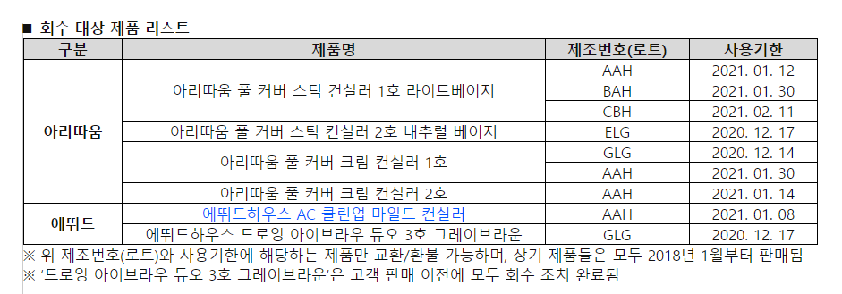 교환·환불 기간은 다음 달 2일까지로 전국 아리따움, 에뛰드하우스 매장과 각 브랜드 고객상담센터에서 할 수 있다.