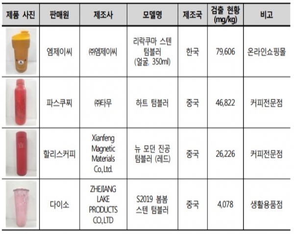 일부 텀블러의 용기 외부표면에 코팅된 페인트에서 다량의 납이 검출됐다.
