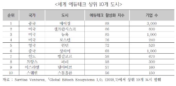 미국에선 특히 샌프란시스코, 뉴욕, 보스턴을 중심으로 에듀테크가 활성화되어 있다. 교육 전문 벤처캐피탈 ‘내비타스 벤터’ 조사에 따르면 2018년 기준으로 세계 에듀테크 도시 20곳 가운데, 미국 내 3개 도시가 2~4위를 차지했다. 이는 보유기업 수, 자금조달, 도시 내 에듀테크 산업 활성화 정도, 교육환경, 정부 정책 등을 기준으로 한 것이다.