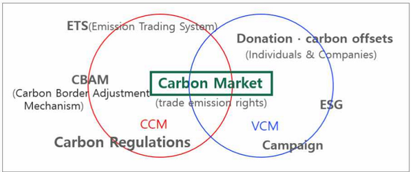 탄소시장은 국가 또는 국제사회에 의한 각종 법적 탄소규제 대응을 위한 규제시장(CCM, Compliance Carbon Market)과 기업이나 개인 등 민간부문의 자발적 탄소감축 활동 참여를 위한 자발적 시장(VCM, Voluntary Carbon Market)으로 나누어진다.