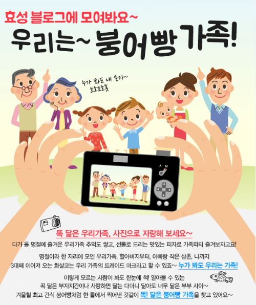 효성은 기업블로그인 ‘마이프렌드 효성(http://blog.hyosung.com)’을 통해 “똑 닮은 붕어빵 우리 가족, 사진으로 자랑해 보세요” 이벤트를 11일부터 25일까지 진행한다. 블로그에서 ‘도플갱어’만큼이나 닮은 가족들의 사진과 사진설명을 메일로 보내면 이벤트에 응모된다. 당첨된 총 30명에게 피자와 콜라를 증정한다.