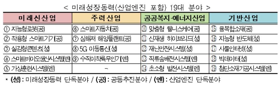 이번에 공개된 '미래성장동력 종합실천계획(안)'은 미래성장동력과 산업엔진프로젝트(산업부)를 통합해 기존 각각 추진해오던 미래성장동력 13대 분야와 산업엔진 프로젝트 13대 분야를 통합해 ‘19대 미래성장동력’으로 확대 개편했다는 특징이 있다.
