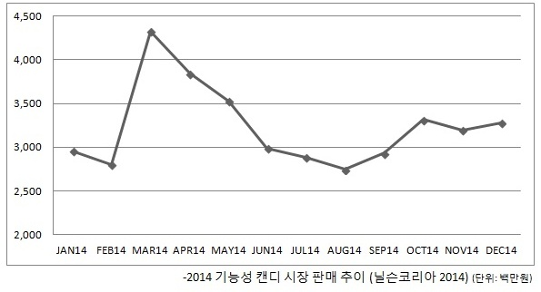 시장조사기관 닐슨코리아의 자료에 따르면 3~4월 기능성 캔디류의 판매량이 연평균 대비 25% 가량 증가했다. 또 지난 2012년에는 국산 기능성 캔디가 60% 넘게 시장을 점유했고 최근 수입 캔디가 급격한 성장세를 보이며 지난해 시장 점유율 50%를 넘어섰다고 밝혔다.