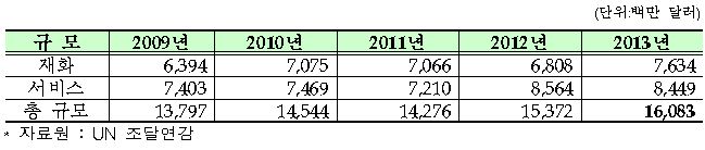 UN 조달시장은 2013년 기준 161억 달러 규모의 완전경쟁 시장으로 전년(’12년) 대비 7.1억 달러 증가한 4.6%의 성장률을 기록하는 등 꾸준한 성장세를 보이고 있다. 우리 기업의 '13년 수주 실적은 약 7,750만 달러로 5,260만 달러에 그쳤던 '12년도 대비 47% 증가하며 사상 최대 규모를 기록한 바 있다.