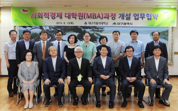 대구시와 대구가톨릭대는 13일 대구시청에서 사회적경제대학원 신설에 따른 업무협약을 체결했다. 지자체의 행정적 지원과 대학의 우수한 교육 인프라를 연계해 사회적경제 전문가 육성에 적극 협력하기로 했다. 특히 대구시는 신입생 모집 등 홍보, 졸업생에 대한 사회적경제 사업 인재 활용 등 행정적 지원을 할 계획이다.