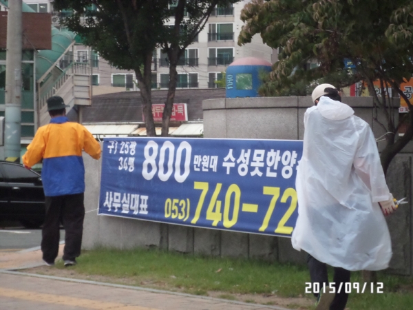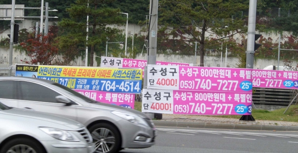이에 수성구는 최근 지역주택조합원 모집을 위해 무분별하게 설치되고 있는 불법현수막의 근절로 지역주민들이 피해를 입지 않도록 홍보와 단속활동을 대폭 강화한다는 방침이다.