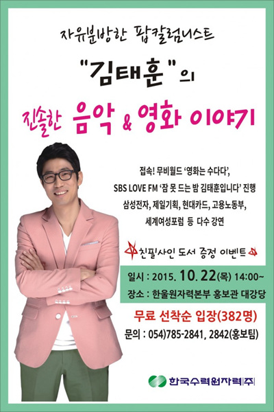 [애플경제=조윤희 기자] 한국수력원자력(주) 한울원자력본부는 10월 22일(목) 오후 2시 한울원전 홍보관 대강당에서 팝 칼럼니스트 김태훈을 초청해 ‘진솔한 음악&영화 이야기’라는 주제로 교양강연을 개최한다.