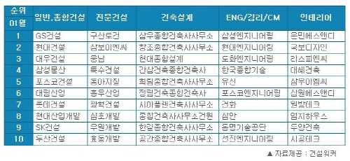 엔지니어링 부문에서는 삼성엔지니어링에 이어 현대엔지니어링, 도화엔지니어링, 한국종합기술, 유신, 포스코엔지니어링, 건화, 삼안, 동명기술공단, 선진엔지니어링 등이 ‘톱 10’에 들었다. 건축설계 부문 ‘톱 10’은 삼우종합건축사사무소, 창조종합건축사사무소, 현대종합설계, 간삼건축종합건축사사무소, 희림종합건축사사무소, 정림건축종합건축사사무소, 시아플랜건축사사무소, 종합건축사사무소건원, 한길종합건축사사무소, 공간종합건축사사무소 등이다. 최근 법정관리에 들어간 공간건축이 4계단 하락, 10위로 밀려났다.