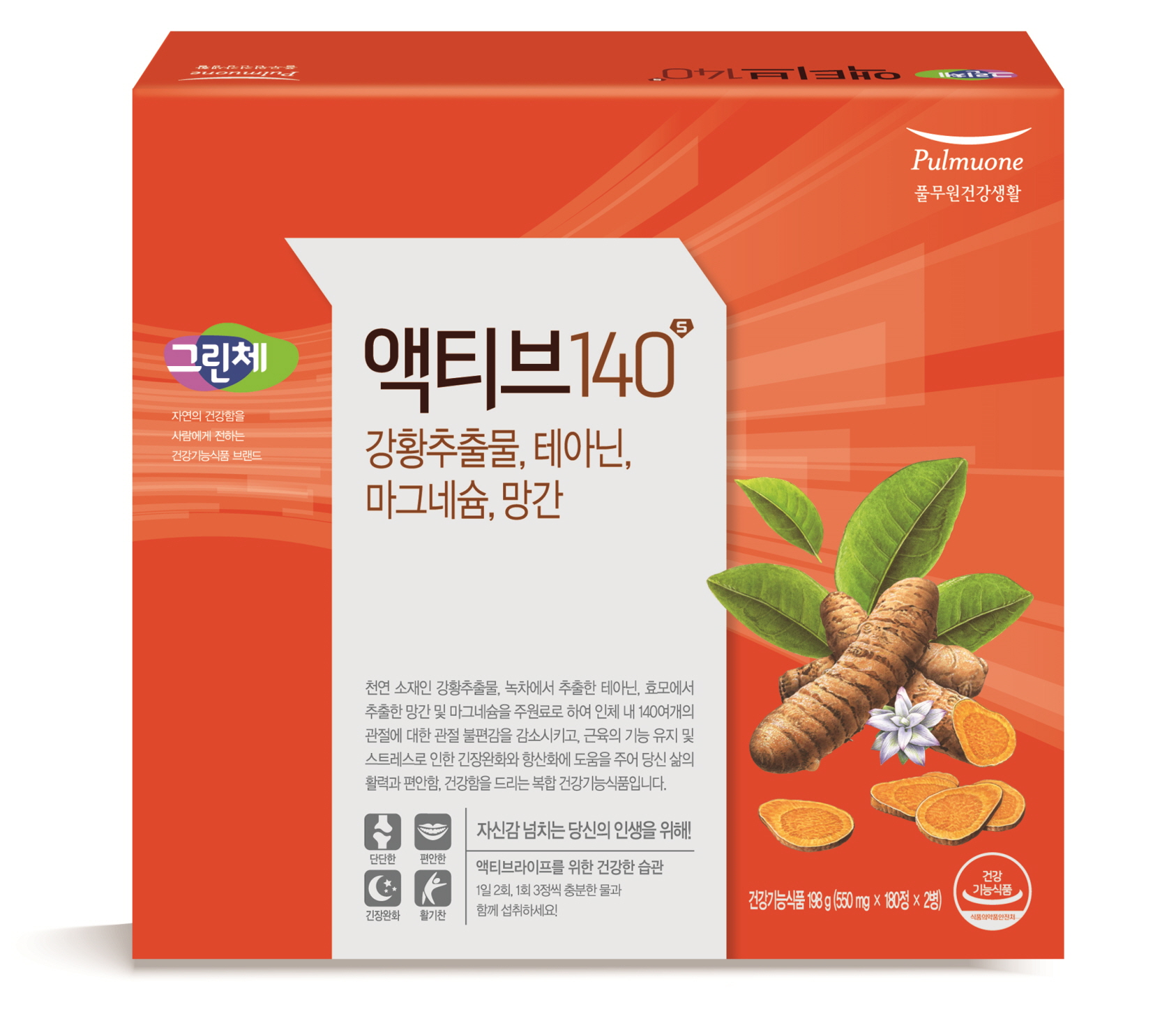 그린체 ‘액티브 140’은 강황추출물, 테아닌, 마그네슘과 망간이 주원료이다. 강황추출물은 인체시험을 통해 1일 1,000mg을 42일 섭취 시 관절마찰음 86.2% 감소하고, 관절삼출물 100%, 관절불편함은 83.3%나 감소함을 확인했다.