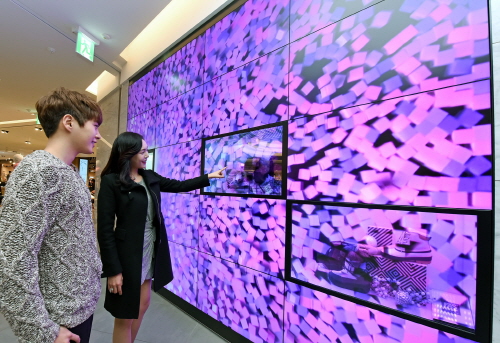 지하 1층 식품관에 고객 동선을 따라 천장을 흐르듯이 설치된 51대의 삼성 스마트 사이니지는 단순한 인테리어의 역할을 넘어 마치 미술관에서 미디어 아트를 관람하는 듯한 느낌을 준다.