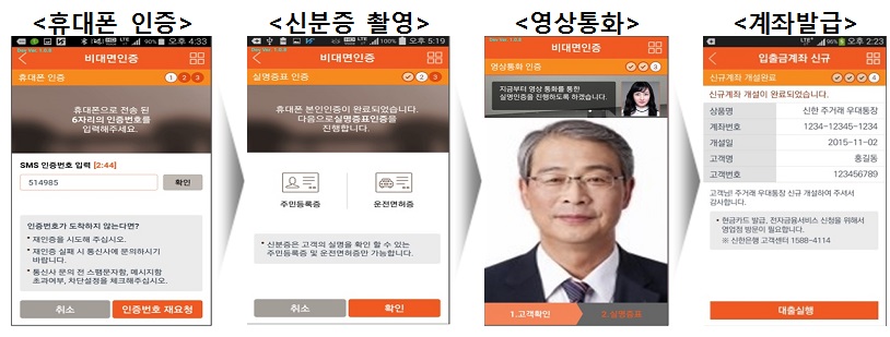 2일, 임종룡 금융위원회장과 조용병 신한은행장, 김종화 금융결제원장, 전 융 금융보안원 본부장, 양현근 금융감독원 부원장 보 등 금융계의 주요인사들이 신한은행에 모여 비대면 실명확인 서비스 시연회를 가졌다.