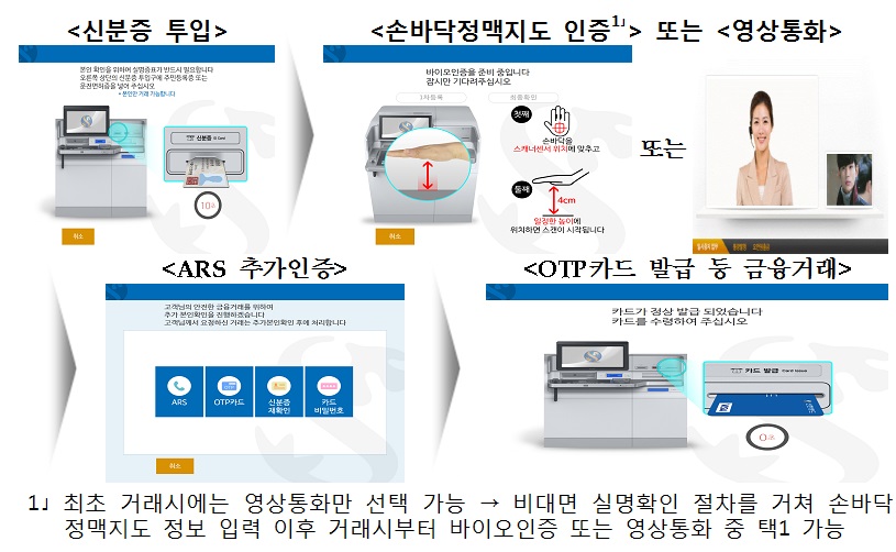 디지털 키오스크를 이용하려면 써니뱅크와 마찬가지로 3중 확인절차(신분증 투입 → 손바닥정맥지도 인증 또는 영상통화 택 1 → OTP/ARS 인증)를 거쳐야한다.
