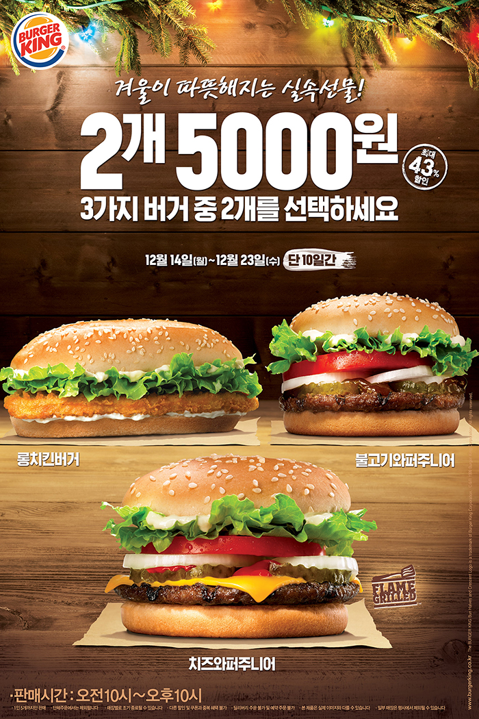 [애플경제=신아랑 기자] 버거킹이 12월 14일부터 23일까지 버거킹 인기 메뉴 3종 치즈와퍼주니어, 불고기와퍼주니어, 롱치킨버거 중 소비자가 원하는 2가지 버거(단품 기준)를 최대 43% 할인된 5,000원에 제공하는 행사를 진행한다.