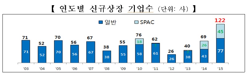한편, 2015년 SPAC 신규상장은 제도 도입해인 2010년 이후 최대규모인 45개사를 기록했으며, SPAC합병을 통해 증시에 신규진입한 기업수도 13사로 최대치를 달성했다. SPAC란 기업인수목적회사(Special Purpose Acquisition Company)로써, 비상장기업 인수합병을 목적으로 하는 회사를 말한다.