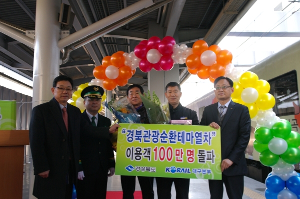 경북도는 2월 29일 전화식 문화관광체육국장, 김종현 코레일 대구본부 영업처장, 열차 관광객 등이 참석한 가운데 동대구역에서 관광열차가 출발하기에 앞서 100만 번째 이용객을 맞아 꽃다발과 기념선물을 전달하며 축하했다