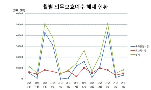 유가증권시장에는 3일 동부제철 1,060만 주를 시작으로 4일 563만 주 동부건설, 6일 92만 주 삼성제약, 15일 삼성물산 15만주 등이다.