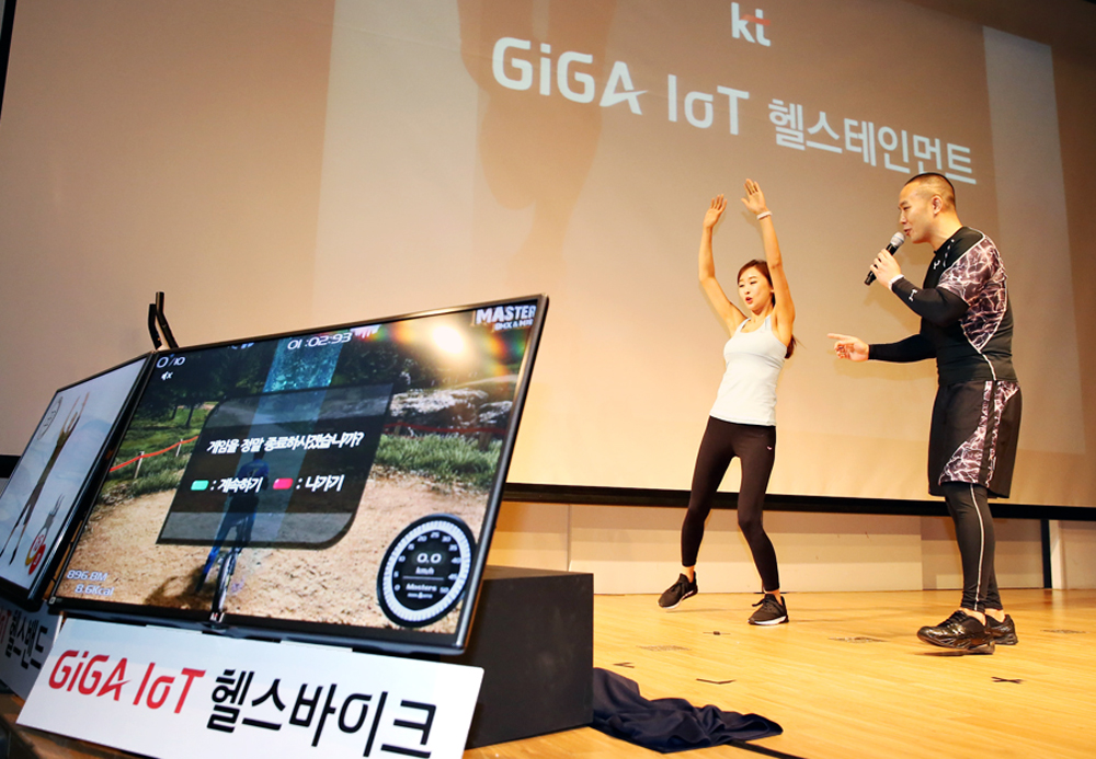 KT는 이날 행사에서 지난 2월 초 출시한 ‘GiGA IoT 헬스밴드’ 외에도 곧 출시 예정인 ‘GiGA IoT 헬스바이크’, ‘GiGA IoT 헬스 골프퍼팅’ 서비스를 선보였다. 가정에서 단순히 운동기구만을 사용하는 방식에서 벗어나 올레tv에서 제공되는 운동프로그램 영상과 게임으로 재미요소를 반영했다.