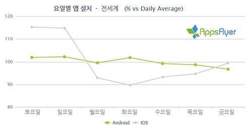 연구 결과에 따르면 전 세계적으로 앱 설치가 가장 많이 일어나는 요일은 주말이며, 특히 iOS의 경우 주말에 앱 설치가 폭등했다. 지역별로 아시아에서 앱 설치가 가장 높은 시간대는 iOS가 오후 8시에서 11시, 안드로이드는 오후 12시에서 2시, 오후 8시에서 10시인 것으로 나타났다.