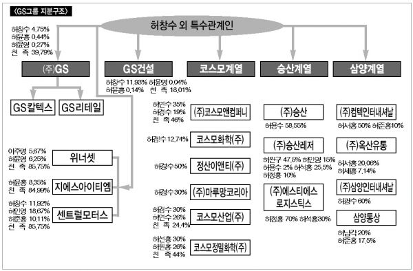GS그룹은 2005년 2월 LG그룹에서 계열분리됐다. 허씨 일가가 지주회사 (주)GS와 GS칼텍스(구 LG칼텍스정유), GS리테일(구 LG유통), GS홈쇼핑(구 LG홈쇼핑)의 출자부문 및 임대사업 일부를 분할해 GS그룹을 분리했다. GS그룹은 분리 이후 LG그룹과는 별도로 운영되던 승산, 코스모 등을 계열사로 편입해 그룹규모가 늘어났다.