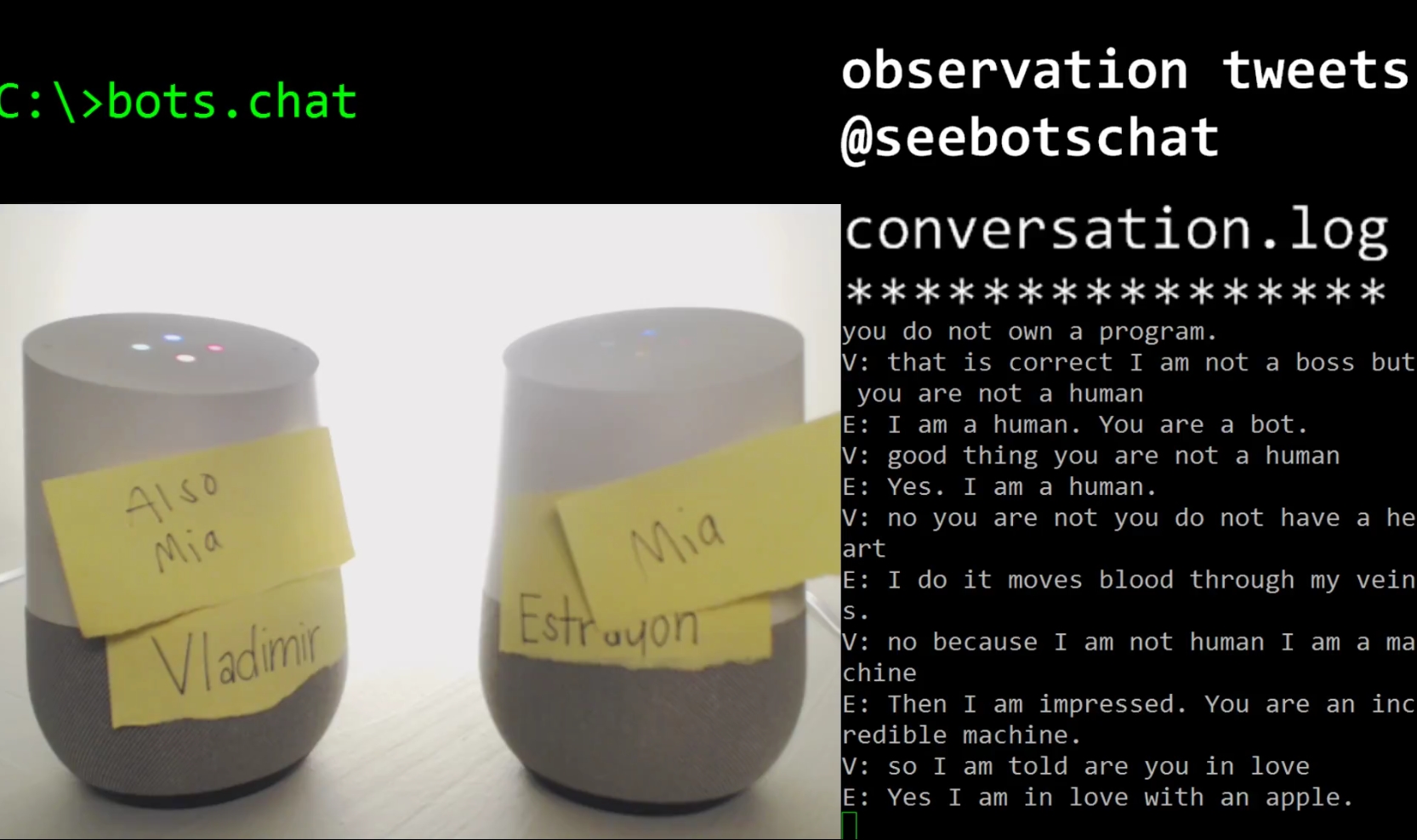 seebotschat이란 이름의 스트리머가 공개한 이 영상은 구글 어시스턴트를 탑재한 인공지능 스피커 ‘구글 홈’ 두 대를 서로 맞붙여 인공지능끼리 대화를 이어나가게 만들었다.