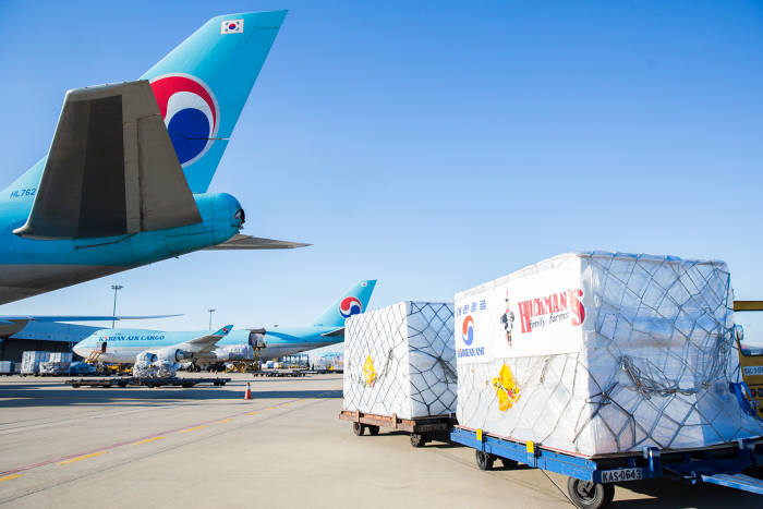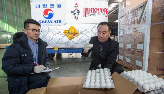 대한항공은 14일 오전 미국 로스엔젤레스에서 출발한 B747-8F 특별화물기편에 계란 100톤을 싣고 인천공항에 첫 수송했다고 밝혔다. 이날 들어온 계란은 다음주부터 시중에 유통될 예정이다.