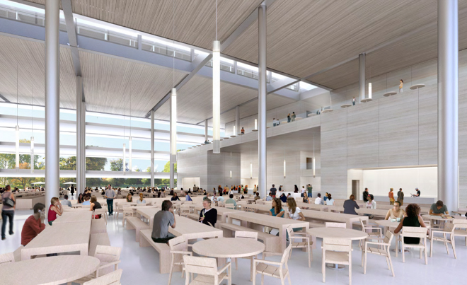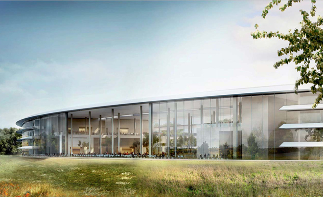 애플 캠퍼스2 중심에는 우주선 모양으로 생긴 26만㎡ 규모의 4층 건물이 들어서며, 이 안에는 약 1만3000명이 근무할 사무실과 연구시설, 3000석 규모의 카페테리아, 운동시설로 채워진다. 애플 캠퍼스2 옆면은 전면 유리로 시공됐는데 이는 전 세계에서 가장 큰 곡면 유리다.