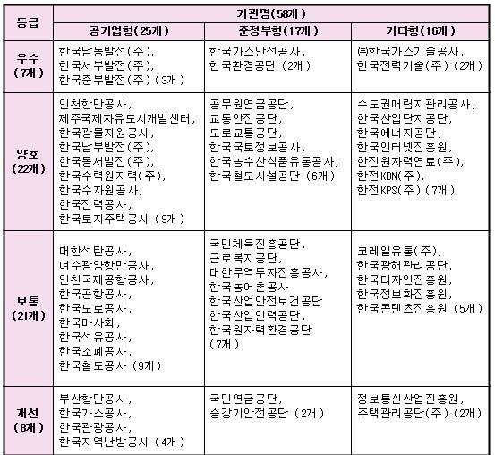 부산항만공사, 한국가스공사, 한국관광공사, 한국지역난방공사, 국민연금공단, 승강기안전공단, 정보통신산업진흥원, 주택관리공단 등 8개 기관은 상대적으로 ‘개선’이 필요한 등급으로 평가됐다.