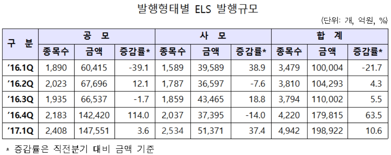 예탁원 관계자는 "특히 최근 유럽·홍콩 등의 증시 상승세로 투자심리가 회복돼 이들 시장의 주요지수인 유로스탁스(EUROSTOXX) 50, 홍콩항셍지수(HSI) 등을 기초자산으로 하는 ELS 발행이 전분기 대비 큰 폭(각각 91.4%, 230.6%)으로 늘어났다"고 말했다.