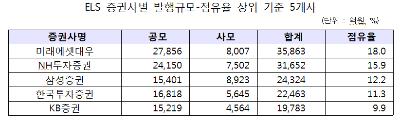 예탁원에 따르면 상위 5개 증권사가 전체 발행금액의 67.4%를 차지한 것으로 나타났다. 증권사별 발행규모로는 미래에셋대우가 3조5863억원을 발행해 1위를 기록했다. NH투자증권과 삼성증권이 각각 3조1652억원, 2조4324억원을 발행해 그 뒤를 이었다.
