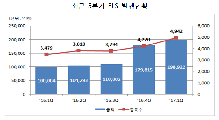 예탁원은 글로벌증시의 안정적인 기조와 조기상환 증가에 따른 발행사의 발행 여력 증가 및 투자자의 재투자수요 등으로 ELS 발행량이 증가한 것으로 해석했다.