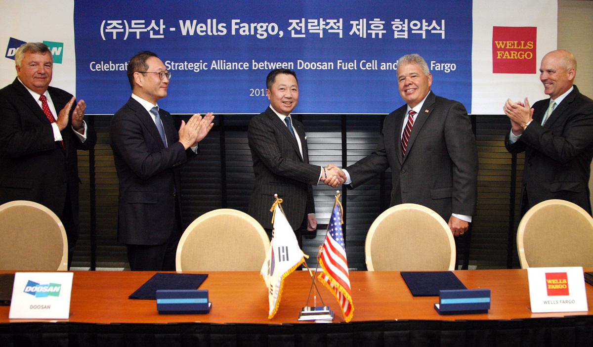두산 연료전지 사업 미국법인인 두산퓨얼셀아메리카도 미국 웰스파고(Wells Fargo) 은행과 연료전지 연료전지 사업 확대를 위한 전략적 제휴 협약식을 가졌다.
