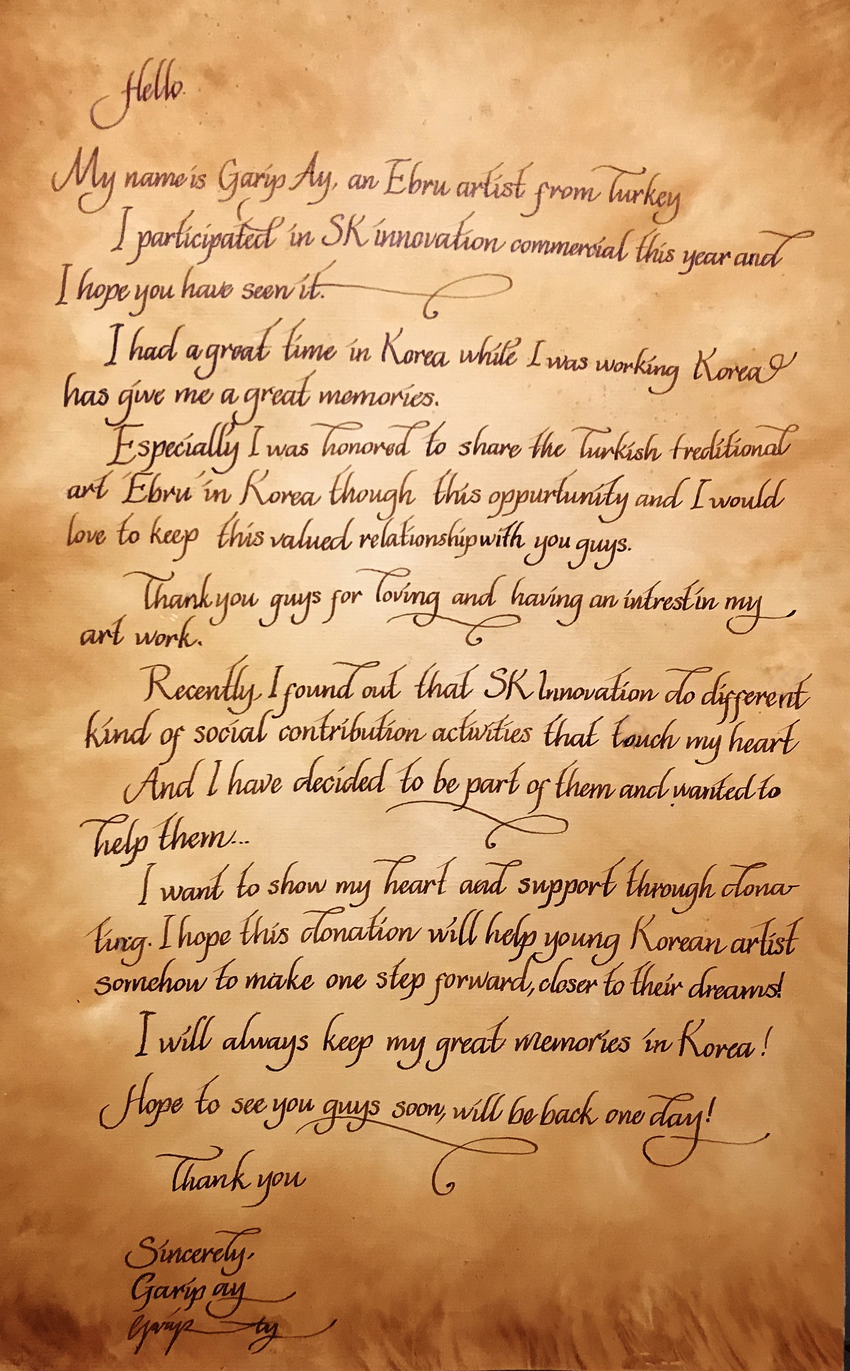사회복지공동모금회는 최근 터키의 예술작가 가립 아이(Garip Ay)로부터 받은 한 통의 손편지를 공개했다.