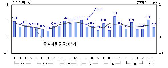27일 한국은행이 발표한 ‘2017년 2분기 실질 국내총생산(속보)’에 따르면 올해 2분기 실질 국내총생산(GDP)은 386조5652억원(계절조정계열 기준)으로 전기대비 0.6% 성장했다. 지난해 같은 기간 보다는 2.7% 성장한 수치다.