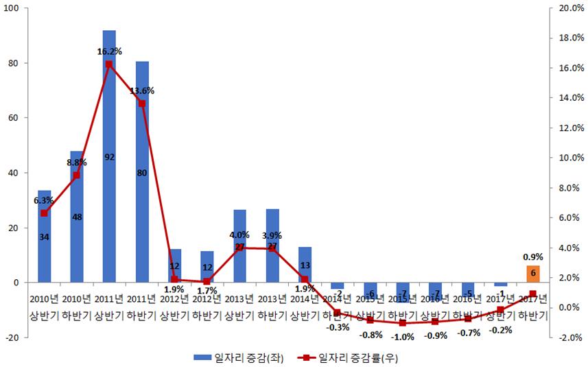 지난 2014년 하반기부터 올해 상반기까지 일자리 증감률이 감소세였던 전자 업종은 기업 수익성 개선에 영향을 미치는 프리미엄 제품을 중심으로 글로벌 시장에서 선전 중이고, 자국 보호주의 무역정책의 영향을 비교적 덜 받는 반도체·패널·SSD 등 기술경쟁력이 우위에 있는 제품을 위주로 수출이 늘어나면서 지난해 동기 대비 6천 명(0.9%) 가량 일자리가 소폭 증가해 지난해와 비슷한 수준을 유지할 것으로 예상된다.