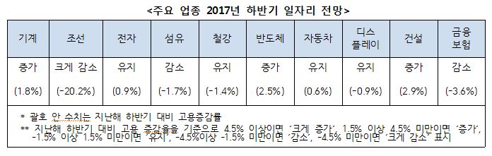 [애플경제] 올해 하반기 기계·반도체·건설 업종의 일자리는 증가하고, 조선·금융보험·섬유 업종은 일자리가 줄어들 것이라는 전망이 나왔다.