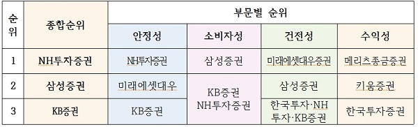 건전성 부문은 미래에셋대우증권이 1위, 삼성증권이 2위, 한국투자증권, NH투자증권 및 KB증권이 공동 3위를 기록했다.