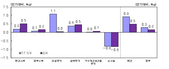 한국은행은 그러나 1분기에 깜짝 성장한 데 따른 기저효과와 민간소비 및 설비투자가 개선된 점에서는 나쁘지 않은 성적표라고 분석했다.