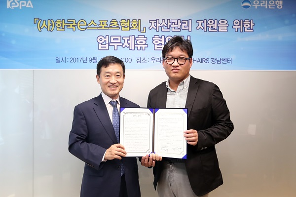우리은행은 7일 서울 역삼동 소재 투체어스강남센터에서 정채봉 WM그룹장과 조만수 한국e스포츠협회 사무총장, 협회 소속 프로게이머 등 관계자가 참석한 가운데 ‘한국e스포츠협회와 소속 프로게이머의 자산관리 지원을 위한 업무협약’을 체결했다고 밝혔다.